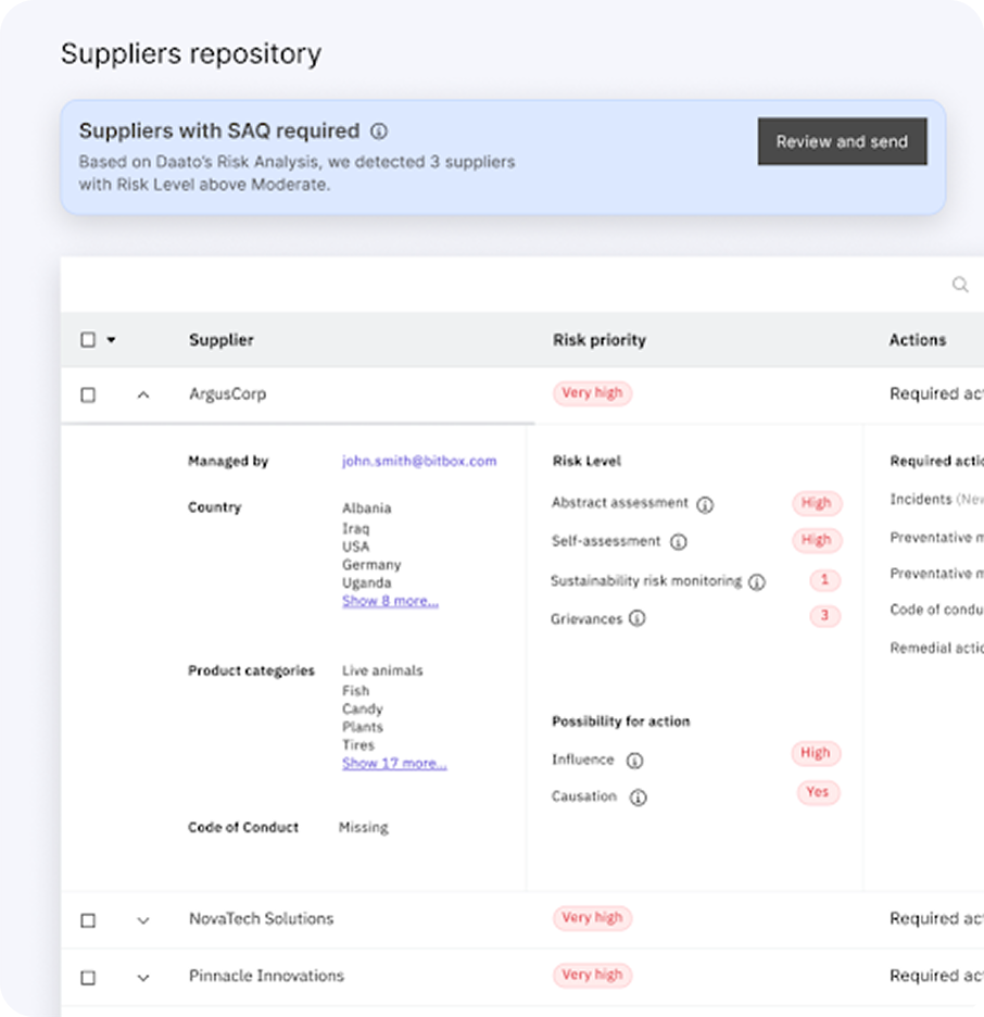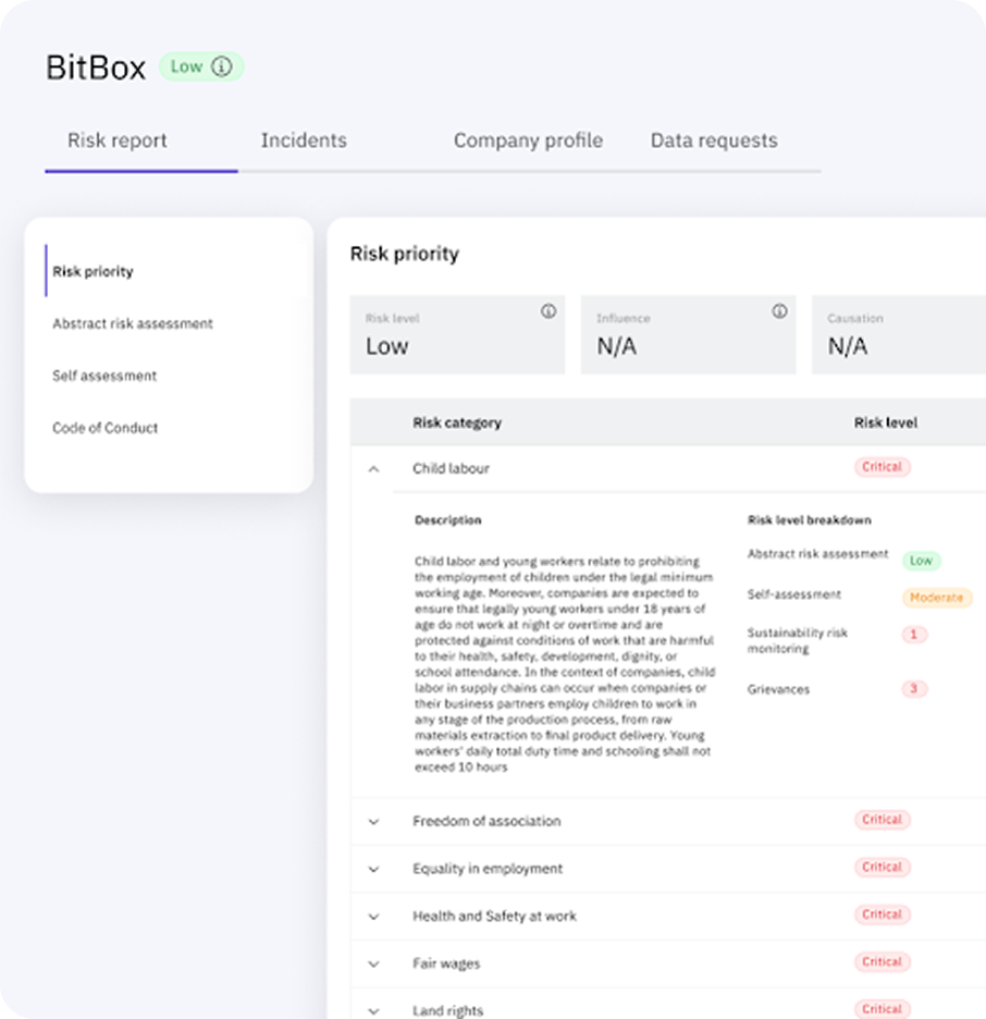 Bewerten Sie Risiken, führen Sie intelligente Lieferantenbefragungen durch, leiten Sie präventive Maßnahmen ein und überwachen Sie Ihre Lieferanten in Echtzeit – alles in einer Plattform, konform zum deutschen Lieferkettengesetz (LkSG) und der EU CSDDD.