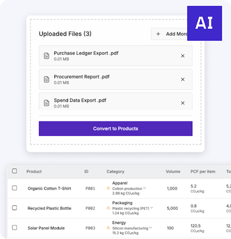 Unsere KI ordnet Ihre Daten automatisch den passenden Emissionsfaktoren zu. Innerhalb weniger Minuten erhalten Sie die ersten belastbaren Produkt-Footprints.