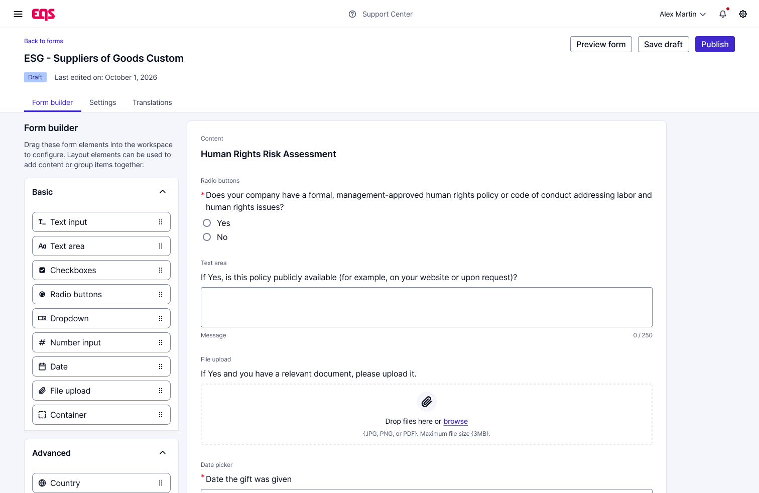 Our third-party due diligence software allows you to build questionnaires using expert-curated templates, including Anti-Bribery and Corruption, ESG, Data Privacy, Health and Safety, and UBO, and tailor them using drag-and-drop builder to match your risk approach. Questionnaires can be shared with multiple contacts, and counterparties complete them via a secure, autosaving, login-free process.