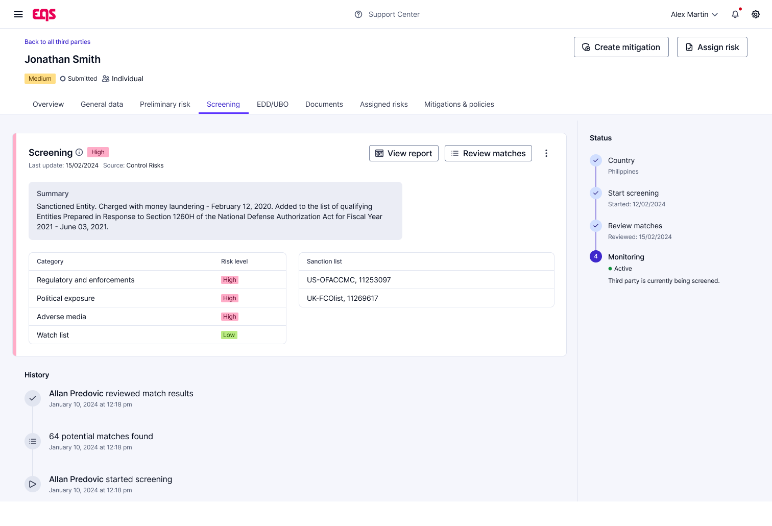Identify potential red flags early with built-in screening checks. Screening results are stored directly in the third-party profile, making risk classification and ongoing monitoring easier and more efficient.