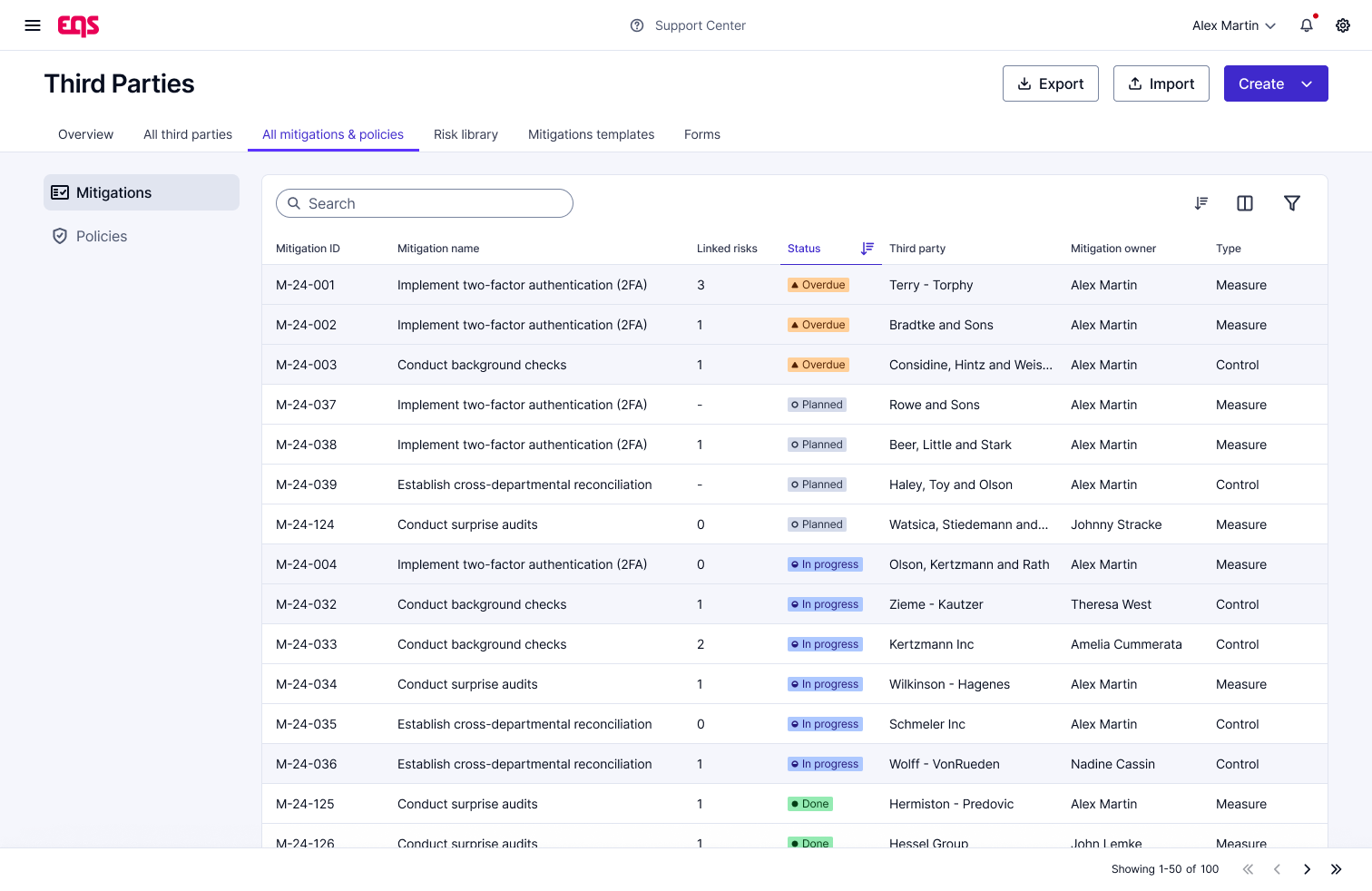 EQS Third Parties gives you a complete set of tools to stay ahead of vendor risk. Review cycles, policy commitments, assessments, screenings, and mitigation deadlines, all tracked within one platform. In-app notifications alert owners as soon as something needs attention, and dashboards highlight which third-parties require follow-up.