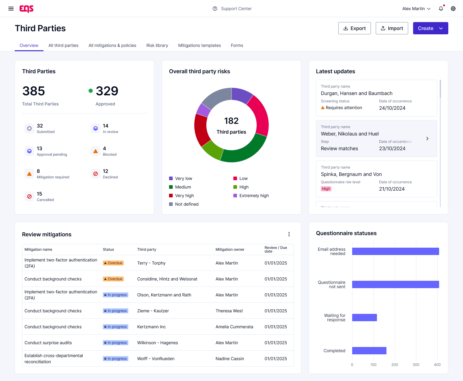 EQS Third Parties gives you a complete set of tools to stay ahead of vendor risk. Review cycles, policy commitments, assessments, screenings, and mitigation deadlines, all tracked within one platform. In-app notifications alert owners as soon as something needs attention, and dashboards highlight which third-parties require follow-up.