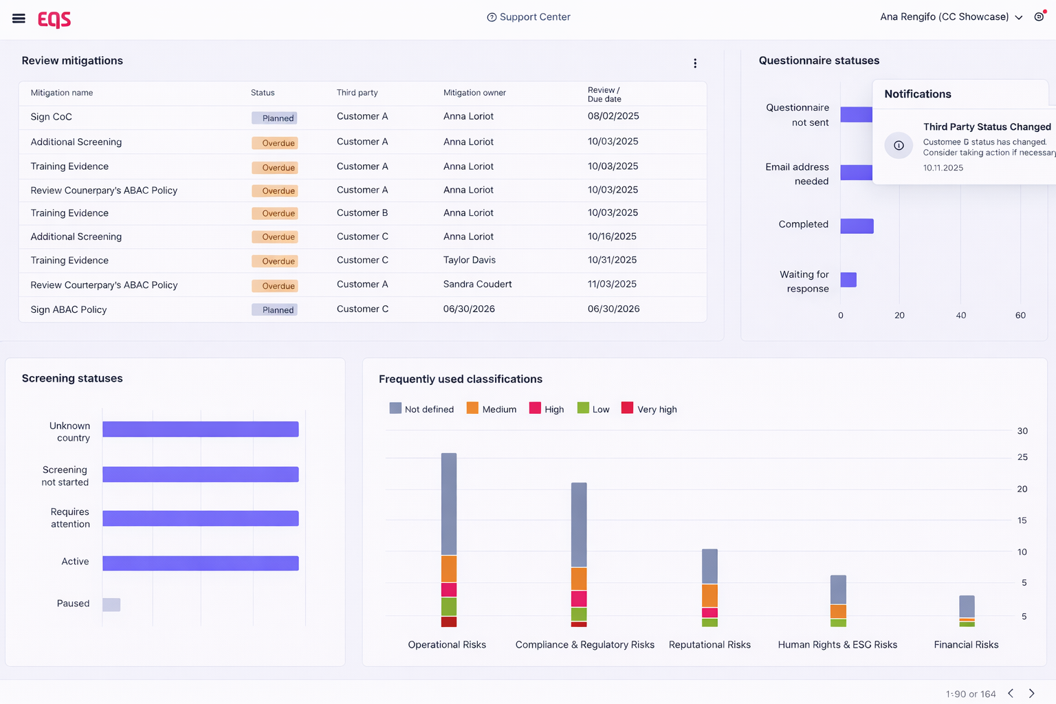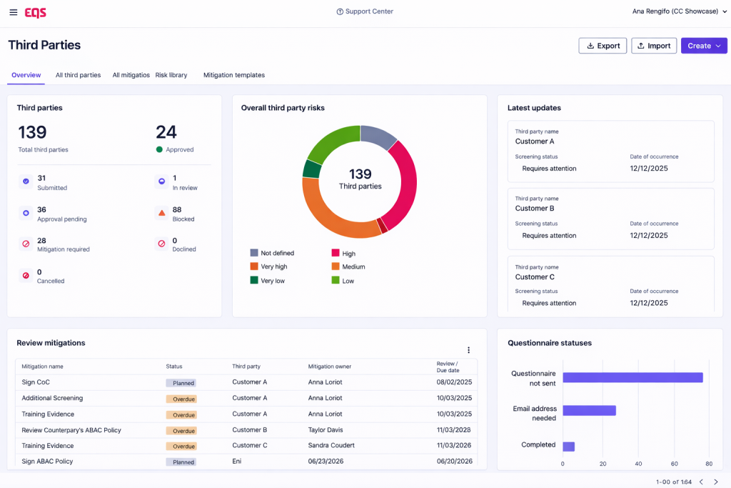 What EQS does: Review cycles are scheduled by risk tier. Screening and questionnaires refresh systematically. The portfolio view gives leadership visibility across all relationships — exposure levels, review status, outstanding mitigations — in a single view.