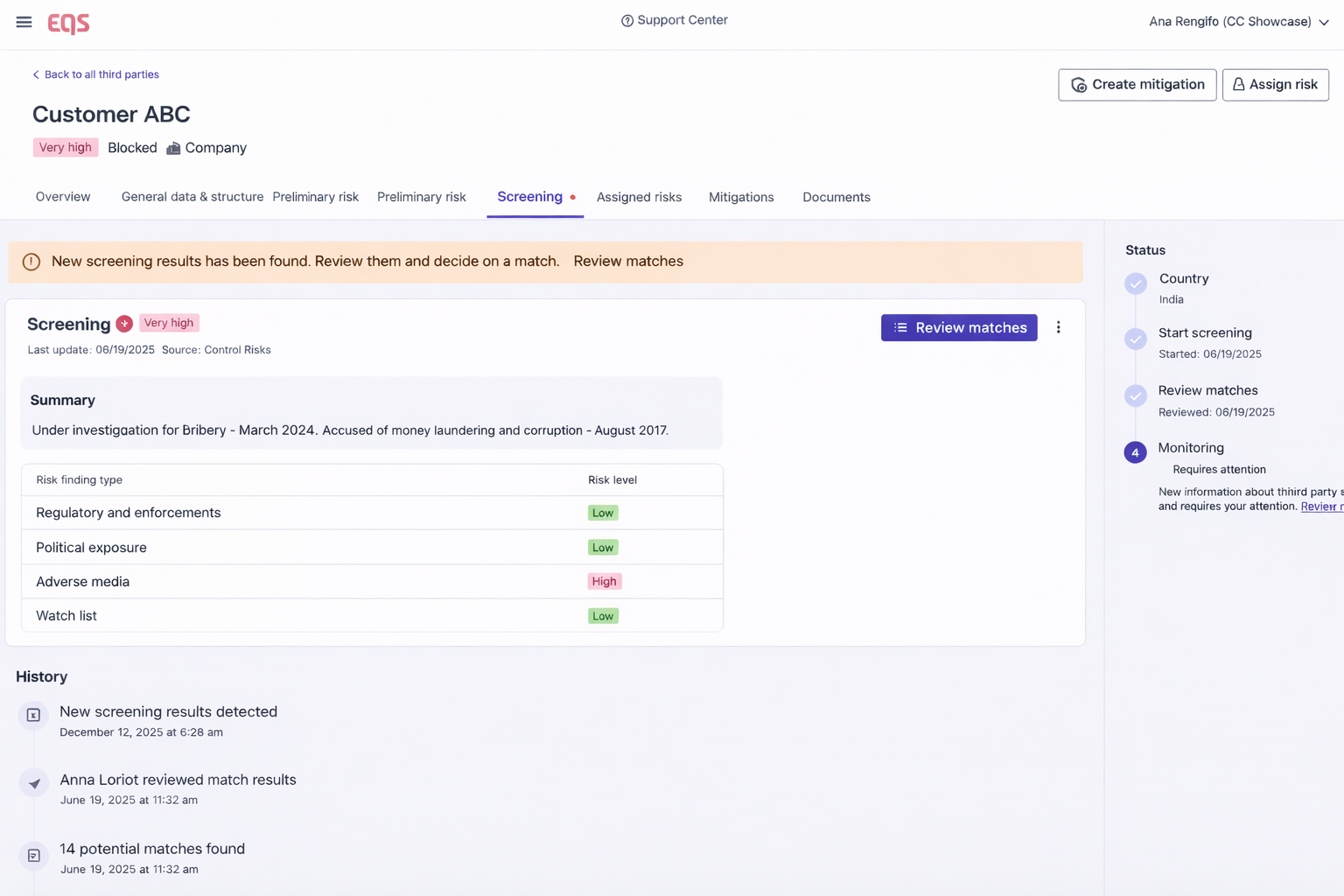 What EQS does: Screening runs against the third-party record. Results are stored inside that record – not exported in a folder, or forwarded to an inbox. Every flag is visible to the reviewer at the point of review.